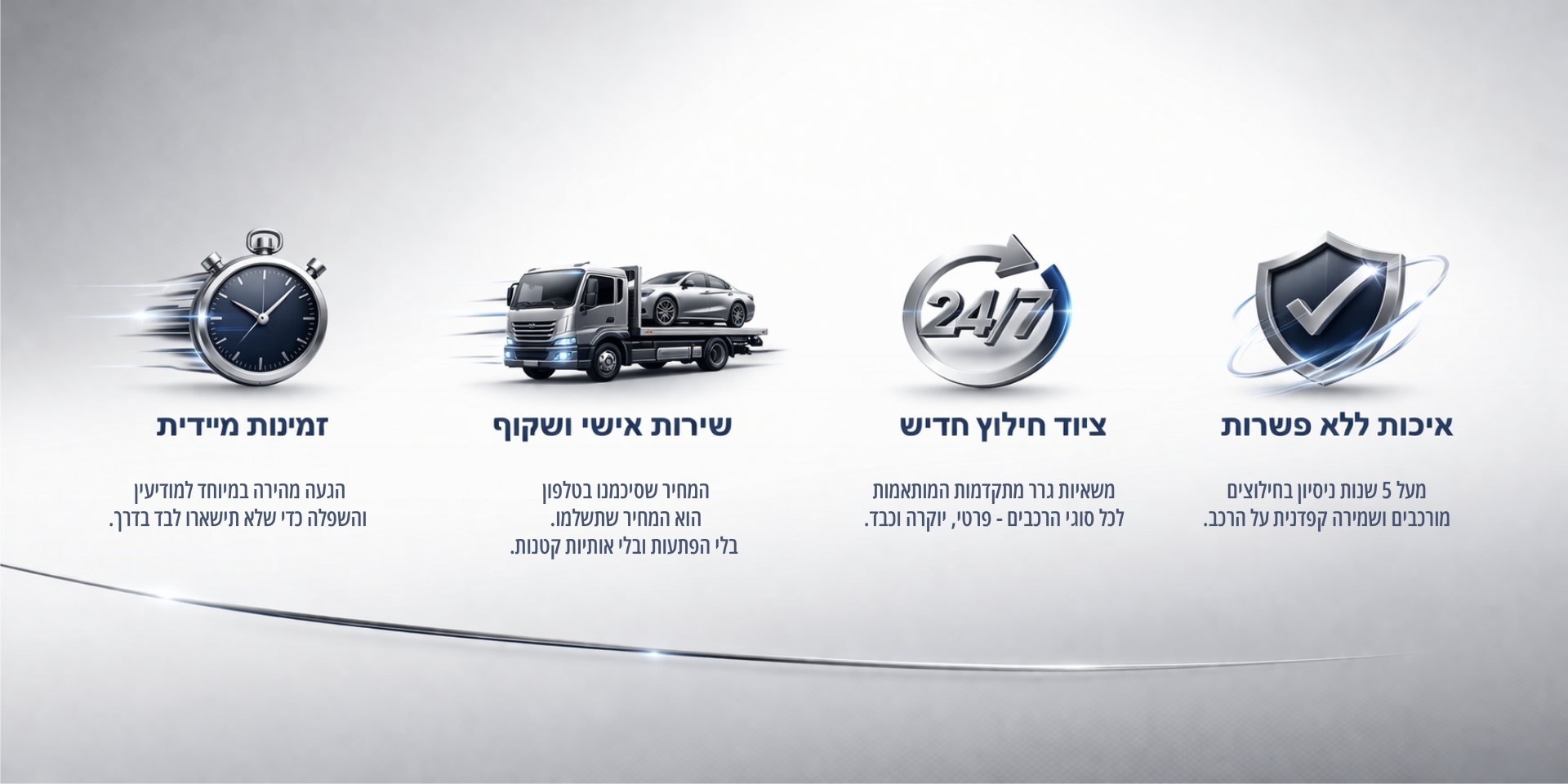 חילוץ מיידי מהדרך ותפעול תקלות בשטח. אנחנו מגיעים אליך תוך דקות ספורות כדי להחזיר אותך לשגרה בראש שקט ובמחיר הוגן.